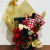 The base features a luxurious mix of deep black, velvet red, and creamy white silk roses, accented with festive red berries and foliage. The central ‘bouquet’ of premium treats and gourmet chocolates is wrapped in a dynamic combination of rich red-and-white checkered print and solid dark wrappers.